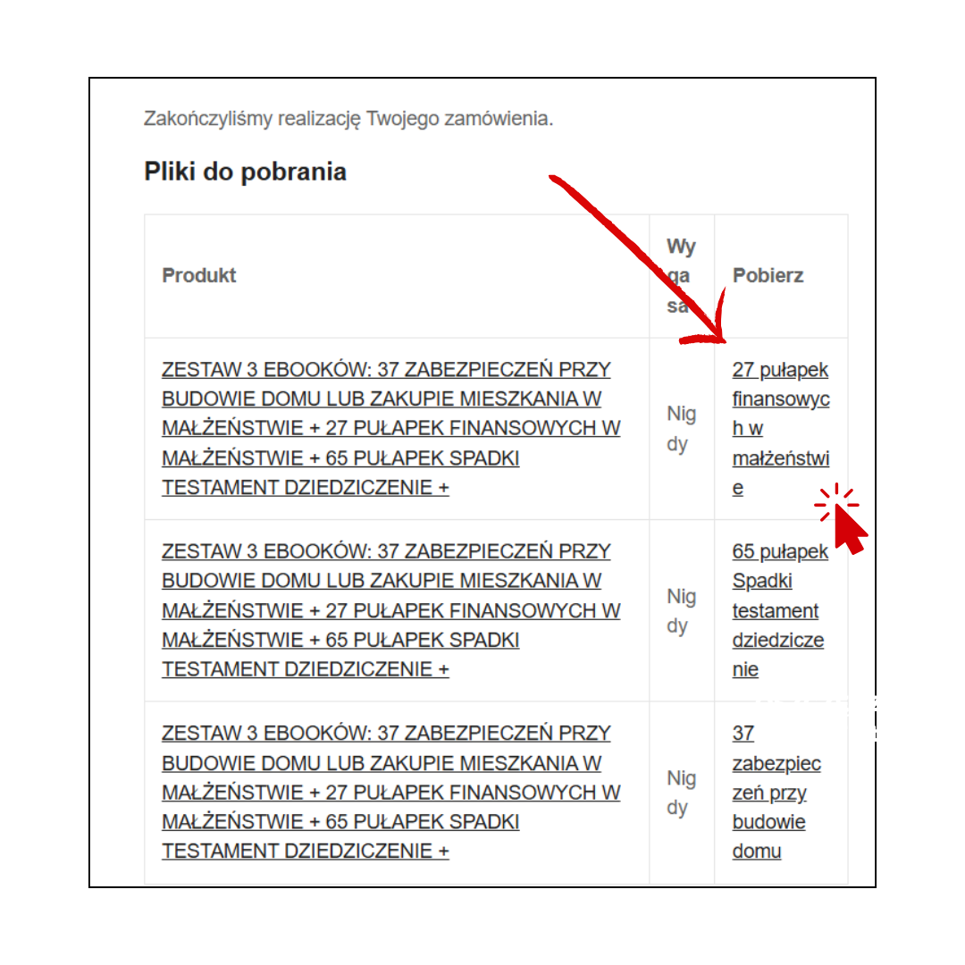 Produkt wysyłany jest automatycznie od razu po zakupie na Twój adres e-mail podany w zamówieniu. Wystarczy kliknąć w link z nazwą produktu w tabelce z napisem PLIKI DO POBRANIA. UWAGA ! produkt nie znajduje się w odrębnym załączniku w e-mailu.