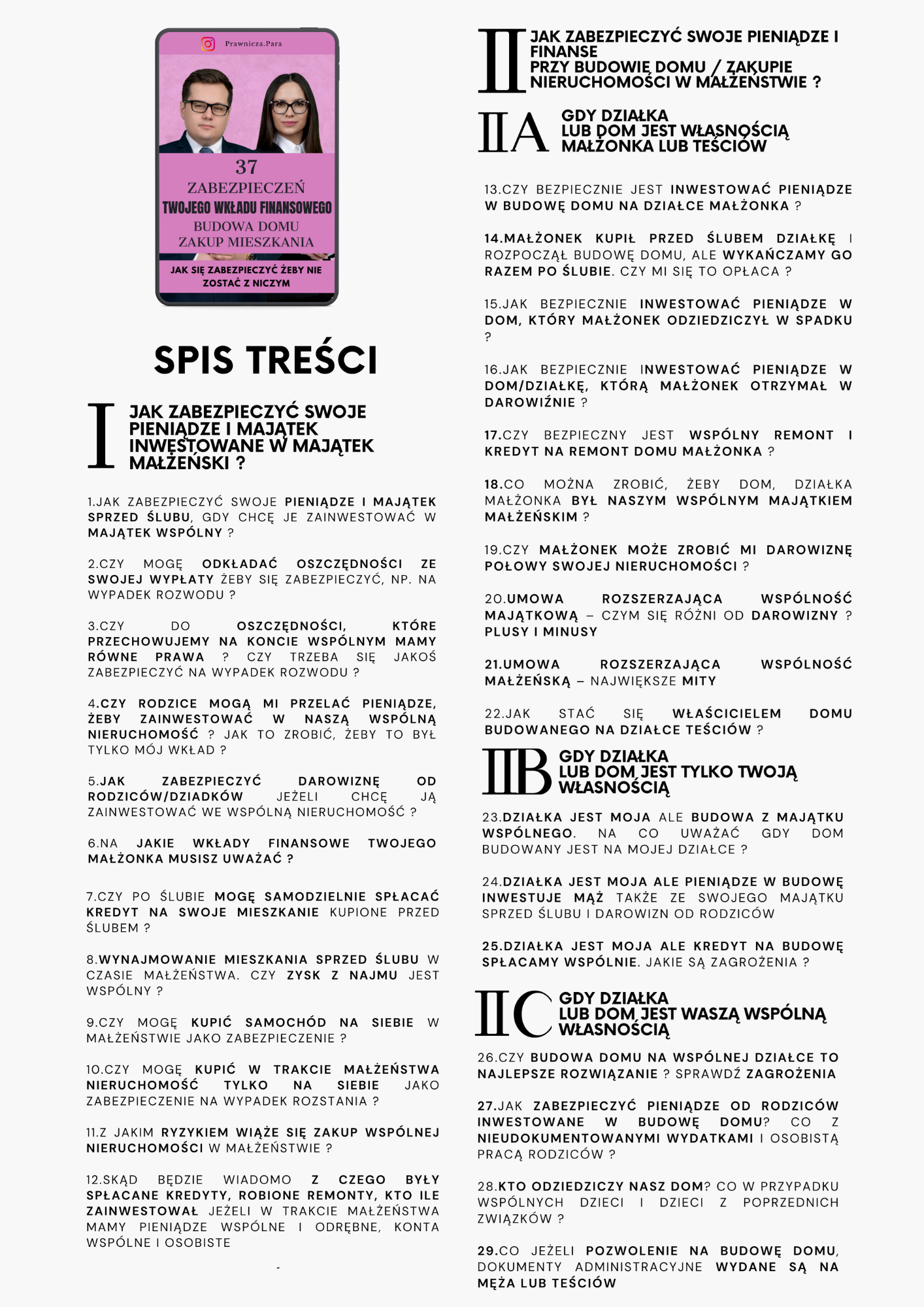 Ebook zawiera 37 zagadnień dotyczących istotnych kwestii finansowych podczas BUDOWY DOMU i ZAKUPU DOMU oraz MIESZKANIA w MAŁŻEŃSTWIE, w którym panuje ustrój wspólności małżeńskiej (czyli małżonkowie nie zawierali tzw. intercyzy i nie wprowadzili rozdzielności majątkowej). To poradnik zarówno dla małżeństw, którzy już kupili lub wybudowali nieruchomość jak i dla tych, którzy dopiero planują. Ebook zawiera propozycje zabezpieczeń Waszych finansowych małżonków w inwestycję (np. pieniędzy sprzed ślubu, darowizn od rodziców czy dziadków, oszczędności, środków z kredytów), tak aby w przyszłości nie było problemów z wykazaniem, kto i ile zainwestował. Poradnik zawiera także symulacje tego, jak wyglądałby podział nieruchomości i rozliczenia finansowe z tym związane (komu należałby się dom, mieszkanie; kto kogo musiałby spłacić; co trzeba byłoby rozliczyć). Znajdziesz w nim wiele różnych wariantów inwestycji małżeńskich, w które jeśli podstawisz kwoty dotyczące Waszej sytuacji, samodzielnie obliczysz jak to będzie wyglądało w Waszym przypadku !