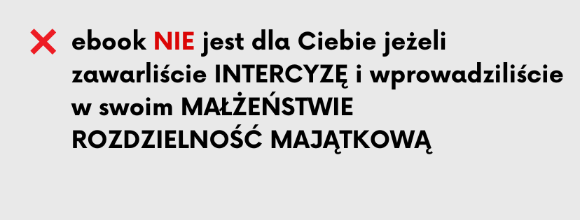 Nie. Zarówno nowy ebook 37 zabezpieczeń przy budowie domu i zakupie mieszkania w małżeństwie jak i 27 pułapek finansowych w małżeństwie dedykowany jest małżeństwom, w których panuje ustrój wspólności ustawowej małżeńskiej, czyli gdy nie zawierali umowy majątkowej/intercyzy i nie wprowadzili rozdzielności majątkowej w swoim małżeństwie.